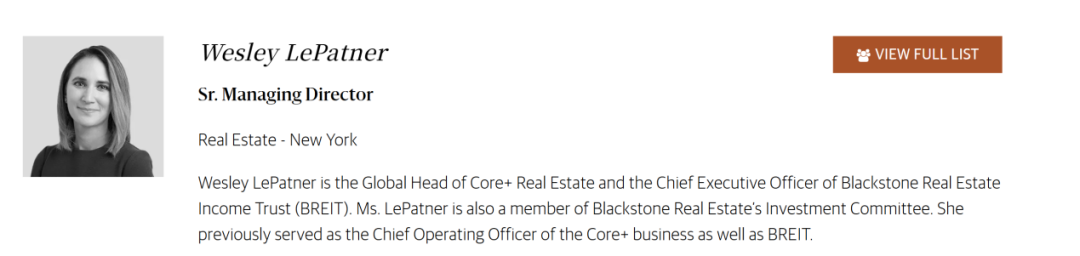 公开贵寓自满,韦斯利·莱帕特纳是黑石集团中枢房地产公共主宰及黑石房地产收入信赖基金(BREIT)首席推行官。她同期担任黑石房地产投资委员会成员。此前,她曾担任中枢+业务及BREIT的首席运营官。