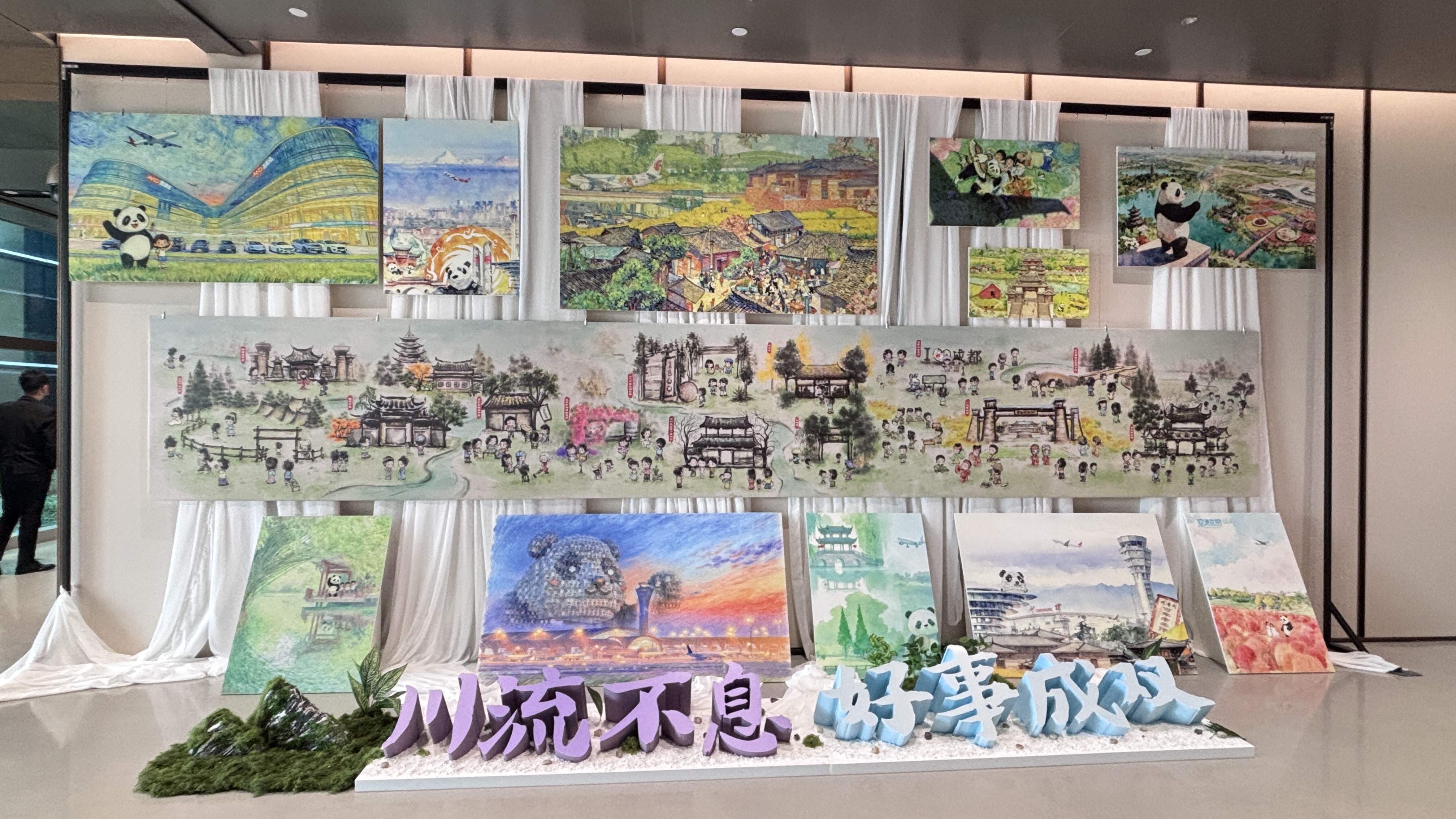 不仅如斯,在空港海外会议中心三楼同步举行的双流区第十一届艺术年展平行系列展上,立异性展出了30余幅数字作品,创作家们多为当地艺术学院在校学生、好意思术机构专科策画东谈主士,作品以“大熊猫”为主题,蚁合展示了双流海外机场、彭镇百苍老茶楼、空港花田、澳康达买卖笼统体等文化旅游地标,这些文商旅交融新场景在创作家笔下栩栩欲活,充分展现了双流闹热发展的满满人命力。