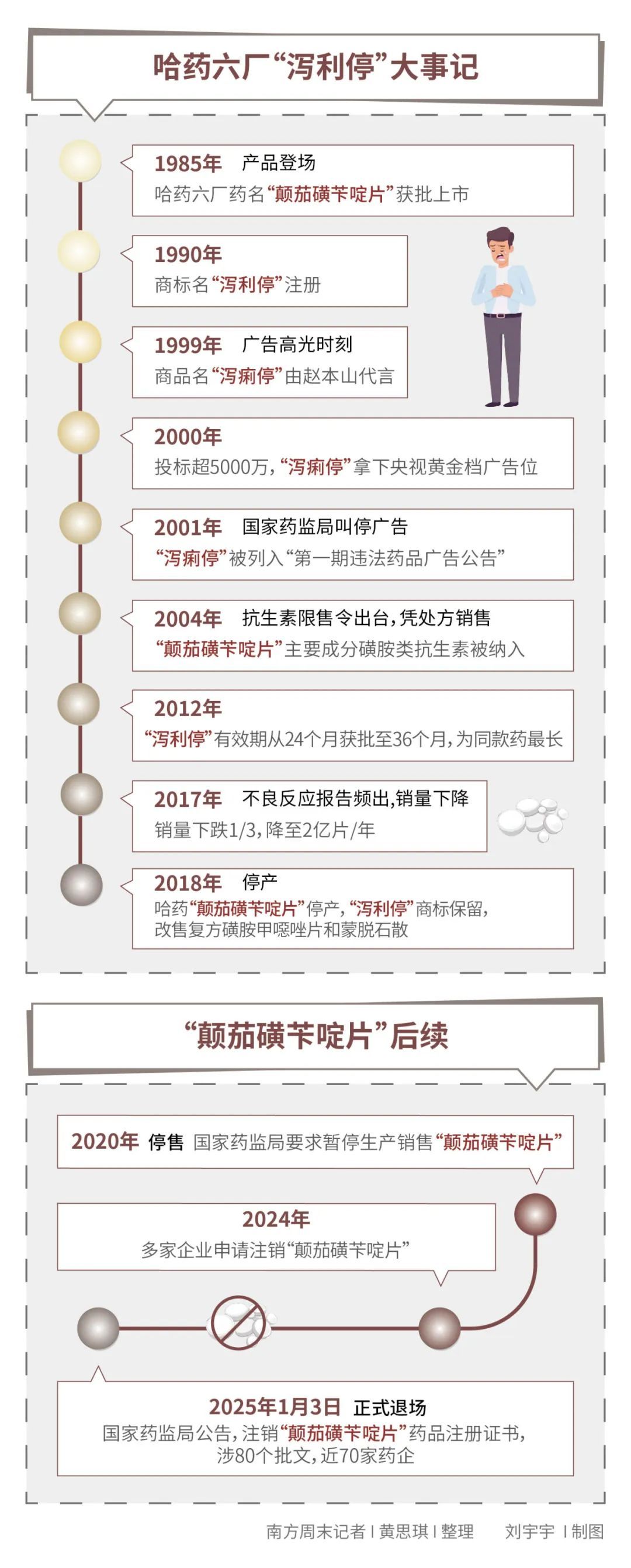 一手捧红该药品的哈药集团制药六厂(下称“哈药六厂”)行状主说念主员向南边周末记者表示,该厂的颠茄磺苄啶片已于2018年停产并刊出。而哈药集团仍捏有“泻利停”商标,替换为其他药品,还在平素出产销售,但愿公众鉴识药品通用名和商品名。